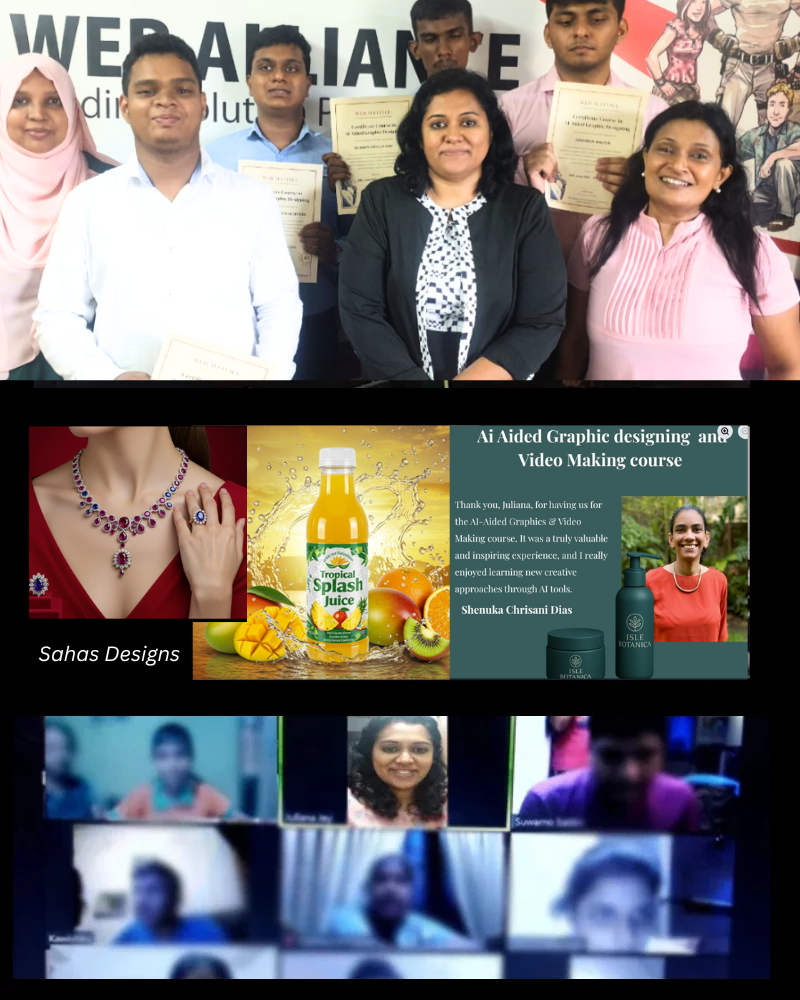 Our AI courses in Sri Lanka are designed for students, professionals, and business owners who want hands-on, results-driven learning. Juliana’s programs focus on practical application — enabling participants to build compelling brand identities, streamline content creation, and master AI-powered tools for social media marketing and digital design.